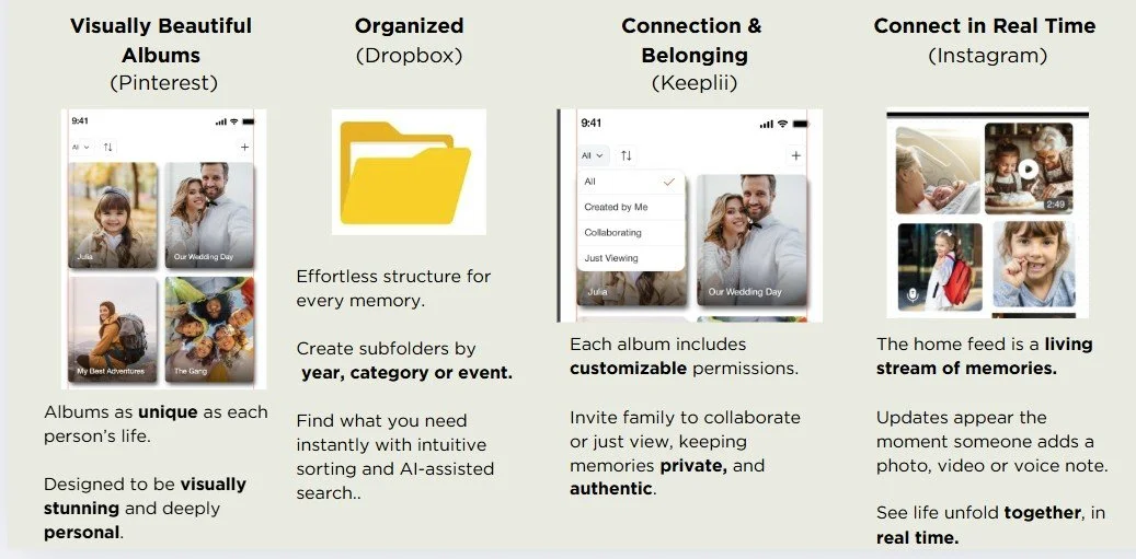 Private memory hubs for families with visually stunning Pinterest-style albums - organized like Dropbox, shared like Instagram and effortlessly brought to life through AI generated videos and multi-media scrapbooks.